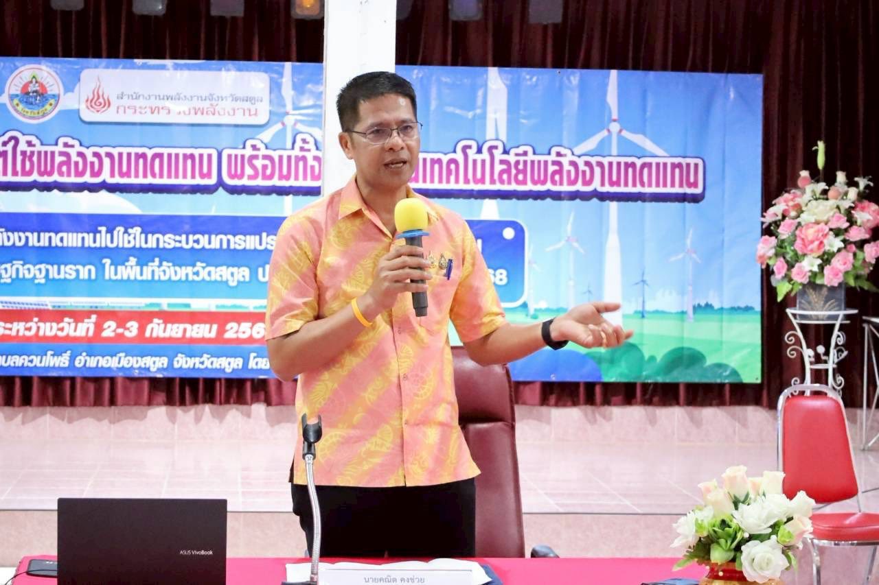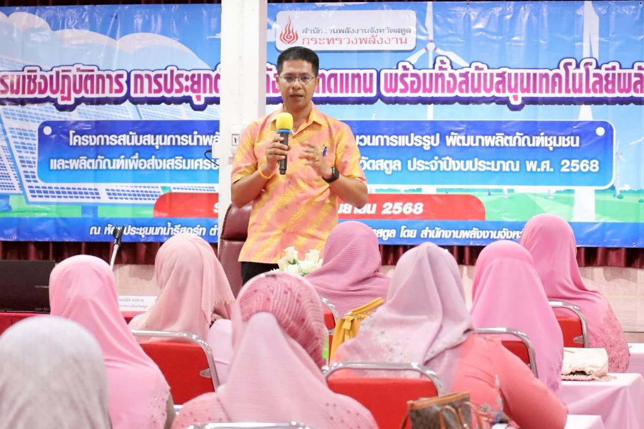วันที่ 2 - 3 กันยายน 2568 สำนักงานพลังงานจังหวัดสตูล จัดกิจกรรมอบรมเชิงปฏิบัติการประยุกต์ใช้พลังงานทดแทน พร้อมทั้งสนับสนุนเทคโนโลยีพลังงานทดแทน “โครงการสนับสนุนการนำพลังงานทดแทนไปใช้ในกระบวนการแปรรูปพัฒนาผลิตภัณฑ์เพื่อส่งเสริมเศรษฐกิจฐานรากในพื้นที่จังหวัดสตูล” โดยมี นายคณิต คงช่วย รองผู้ว่าราชการจังหวัดสตูล เป็นประธานในพิธีเปิดกิจกรรม และนายจิรพงค์ ใจคะจัด พลังงานจังหวัดสตูล กล่าวรายงาน ณ ห้องประชุมนกน้ำรีสอร์ท ตำบลควนโพธิ์ อำเภอเมืองสตูล จังหวัดสตูล